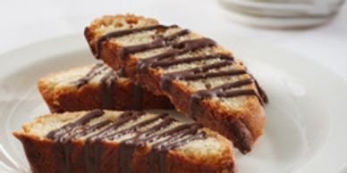 A chocolate ganache striped biscotti with hints of almond essence and chocolate chunks. The perfect compliment to your cup of coffee.